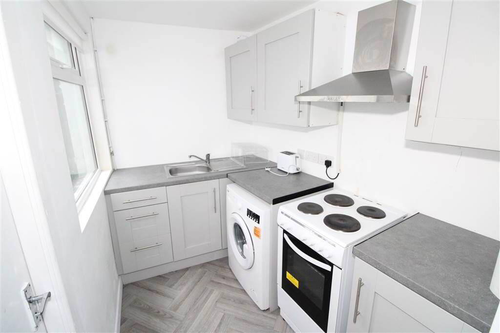 Modern fitted kitchen with a range of storage units, sinngle stainless steel sink unit and finished with vinyl flooring. Plumbed for washing machine.