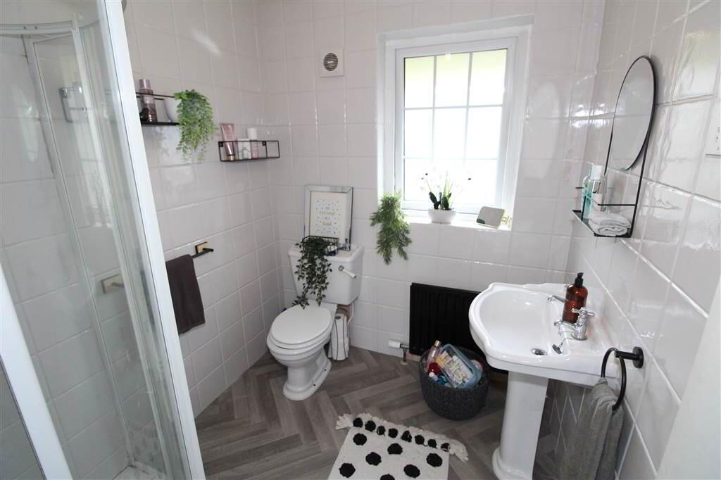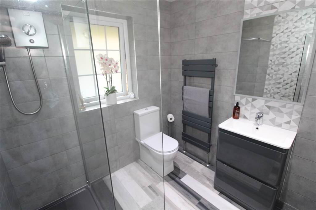 - Fully tiled shower room with white suite comprising of a low flush wc, vanity sink unit, heated towel rail, shower cubicle with electric shower and finished with ceramic tile flooring.