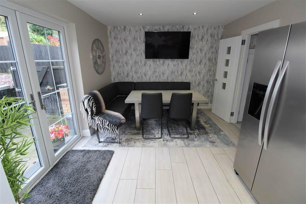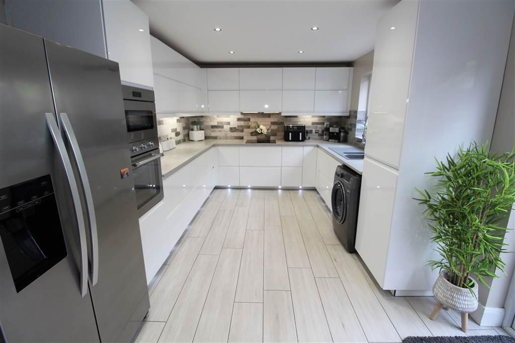 Modern fitted kitchen with a range of high & low level units, 1.5 'Franke' sink unit, electric hob and separate double oven, integrated dishwasher, built in microwave, under cabinet kickboard led lighting, dining area with patio doors leading to rear garden and finished with partially tiled walls and ceramic wood effect tiled flooring. Plumbed for washing machine.