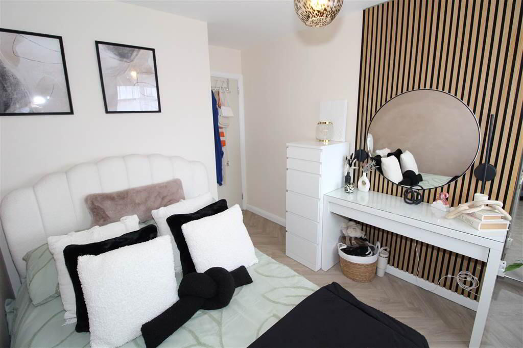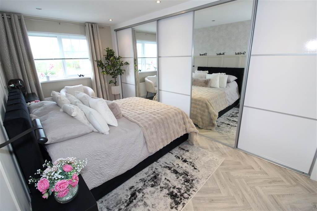Double bedroom with built in sliderobes and vinyl flooring, leading to fully tiled en-suite, comprising of a low flush wc, pedestal wash hand basin and shower cubicle. - BEDROOM (2):