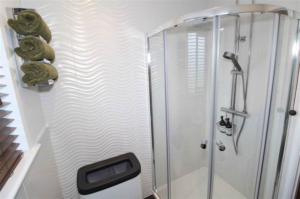 - Partially tiled shower room with white suite comprising of a low flush wc, pedestal wash hand basin and shower cubicle with rainfall shower.