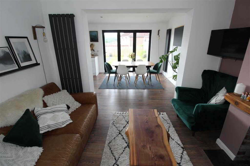 Internally, the property comprises a welcoming entrance hall, living room, open plan family/dining and a fully fitted modern kitchen, three bright bedrooms & a family bathroom with white suite. The property further benefits from uPVC double glazing and GFCH.