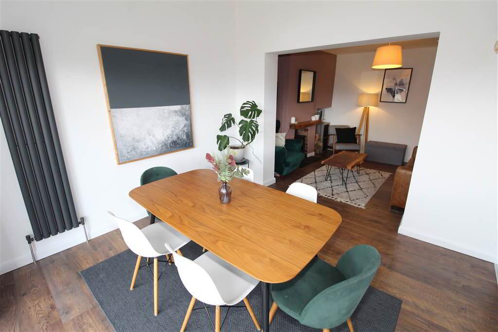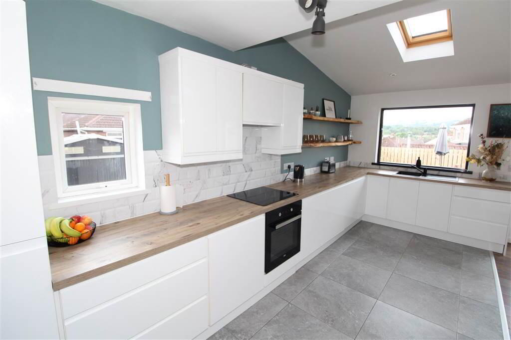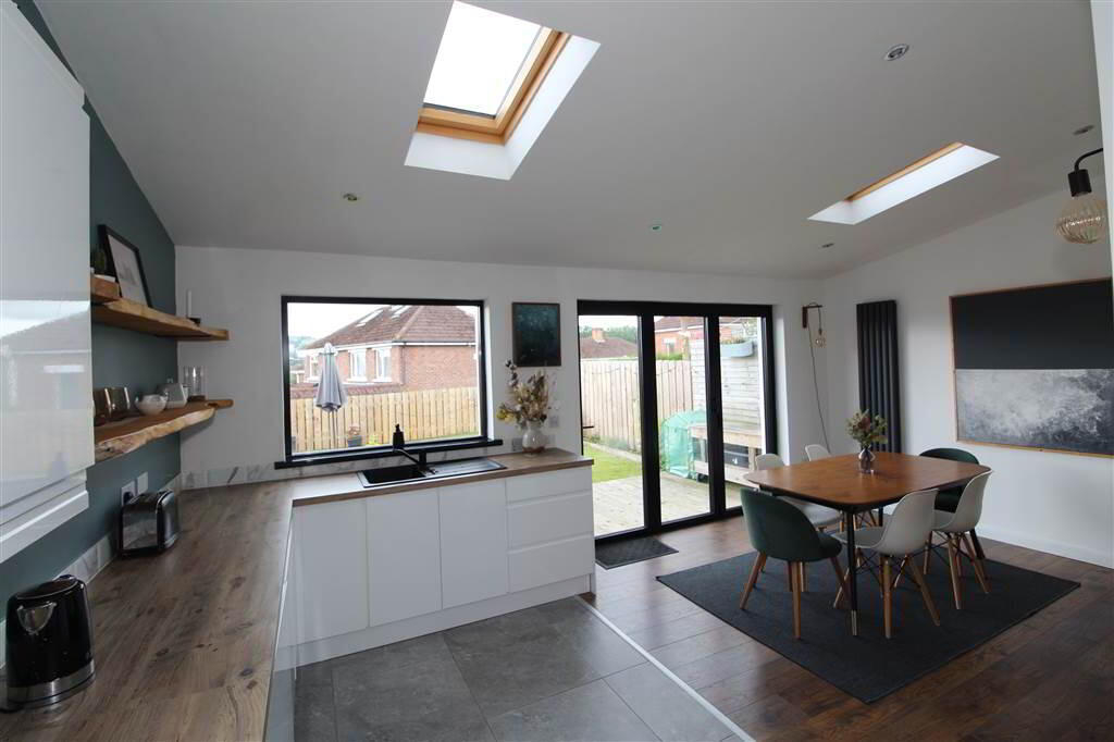 - Open plan family/dining room with wood log burner & byfold doors to rear garden and laminate flooring,...leading to modern fully fitted kitchen with a range of high & low level units, electric oven & hob, black composite sink unit, downlights, velux window and finished with tiled flooring.