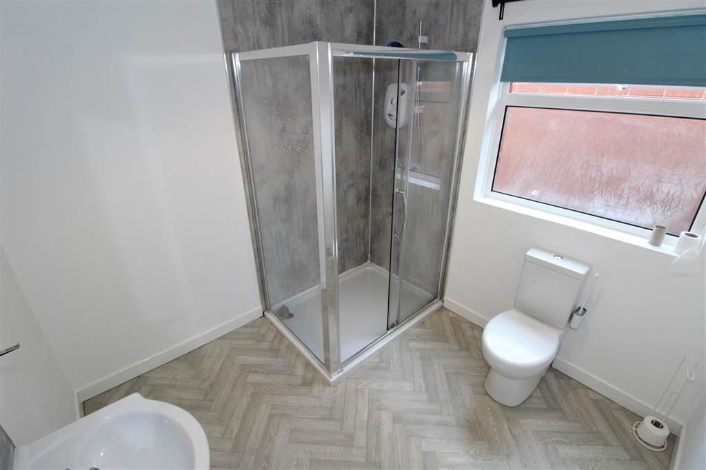 - Shower room with white suite comprising of a low flush wc, pedestal wash hand basin and shower cubicle with electric shower and finished with vinyl flooring.