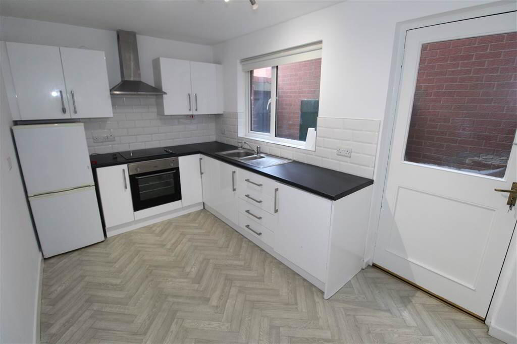 Modern fitted kitchen with a range of high & low level units, 1.5 stainless steel sink unit, electric over and hob and finished with vinyl flooring.