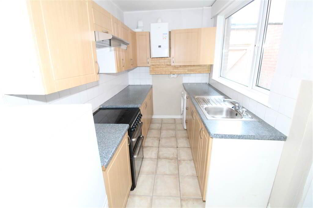 Fitted kitchen with a range of high & low level units, single stainless steel sink unit. Plumbed for washing machine.