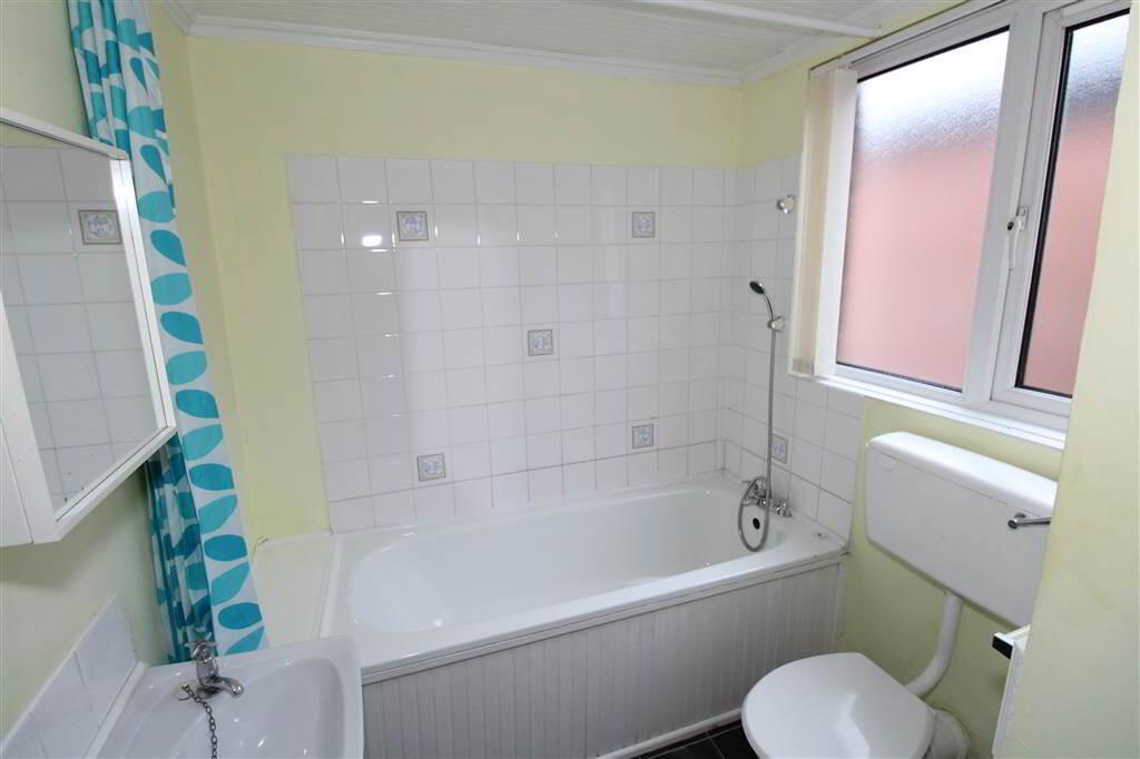 - Bathroom with white suite comprising of a panelled bath with shower from taps, wc, pedestal wash hand basin and finished with partially tiled walls and vinyl flooring.