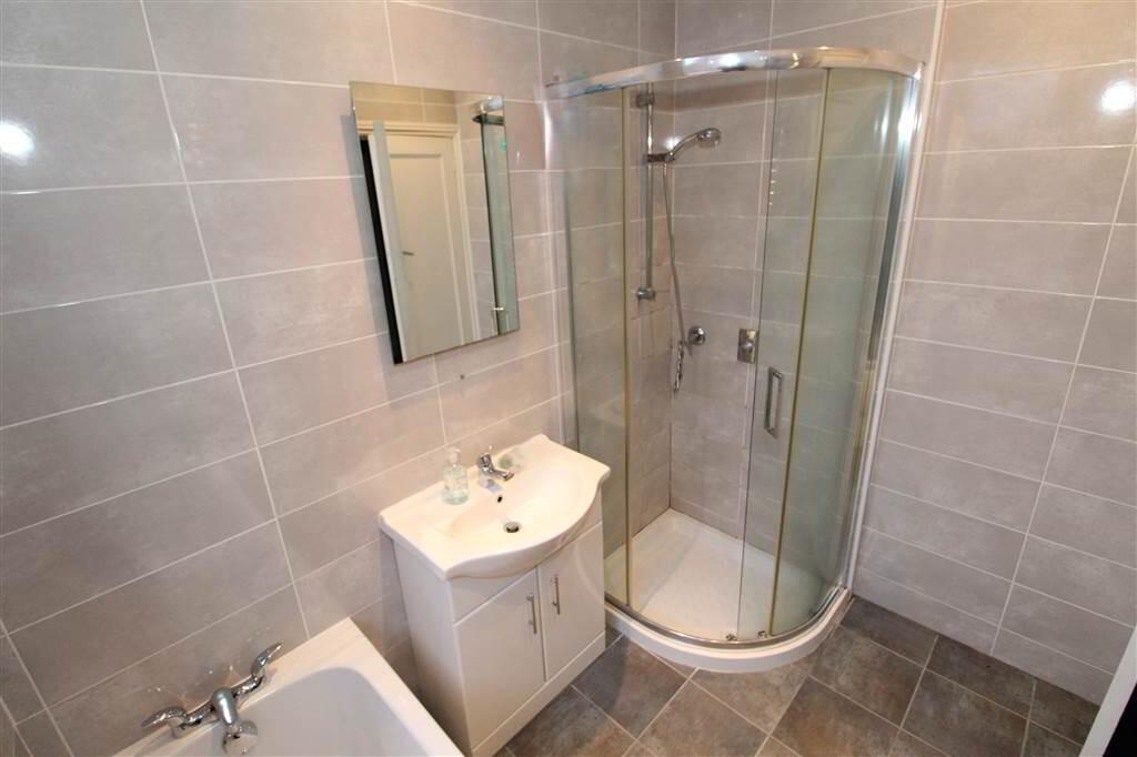 - Fully tiled bathroom with white suite comprising of a panelled bath, vanity sink unit, shower cubicle with thermostatic shower and heated towel rail.
