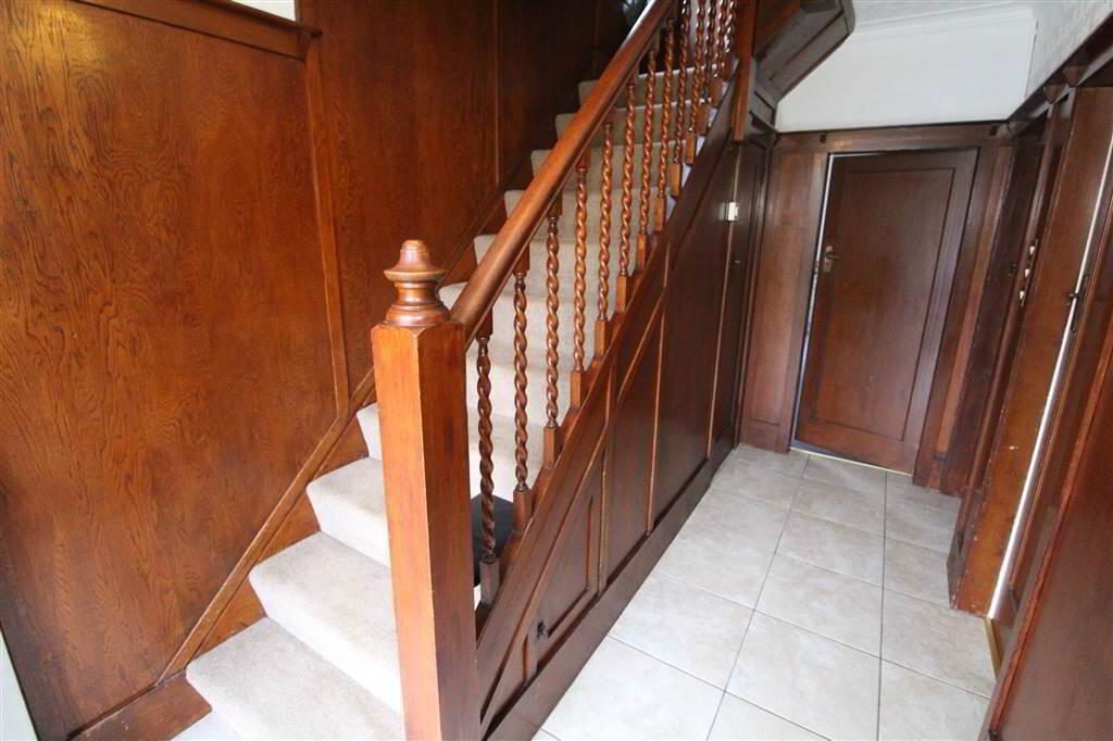 - Large entrance hall with wood panelling and tiled flooring.